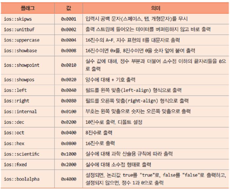 - C++ 입출력 스트림은 아래와 같이 32개의 포맷 플래그(format flag)를 저장하는 멤버 변수를 두고, 이름 참조하여 포맷 입출력