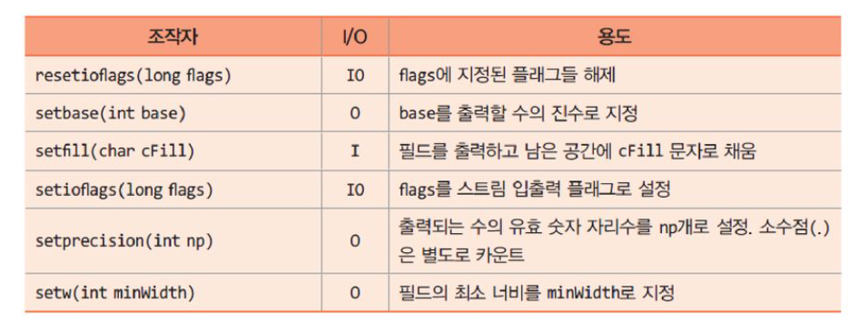 - 조작자는 사용하기 쉽고 출력 코드를 간결하게 만들기 때문에, setf(), width(), fill(), precision() 등의 멤버 함수보다 조작자의 사용을 권한다.