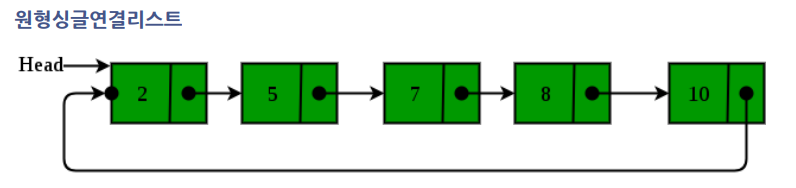 - 싱글연결리스트 또는 이중연결리스트로 이루어진 2가지 타입의 원형연결리스트