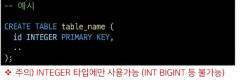 - 만약 INTEGER PRIMARY KEY 키워드를 가진 컬럼을 직접 만들면 이 컬럼은 rowid 컬럼의 별칭(alias)이 됨