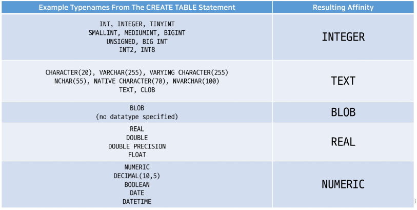 - 데이터 타입 작성 시 SQLite의 5가지 데이터 타입이 아닌 다른 데이터 타입을 선언한다면, 내부적으로 각 타입의 지정된 선호도에 따라 5가지 선호도로 인식됨