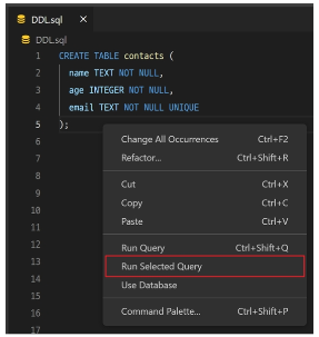 - vscode 실행 후 DDL.sql 화면에서 마우스 우측 버튼 클릭 -> Use Database 선택