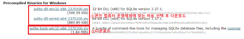 - SQLite 설치 - https://www.sqlite.org/download.html 접속하여 C 드라이브 - sqlite 폴더 생성 후 위 사진에서의 파일 2개 압축 풀기