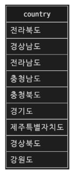 - '%도' 패턴은 도로 끝나는 모든 문자열과 일치 (도, 수도, 경기도 등)