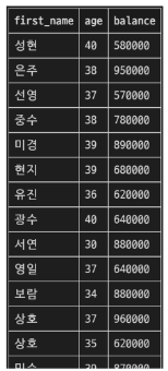 나이가 30살 이상인 사람들의 이름, 나이, 계좌 잔고 조회하기