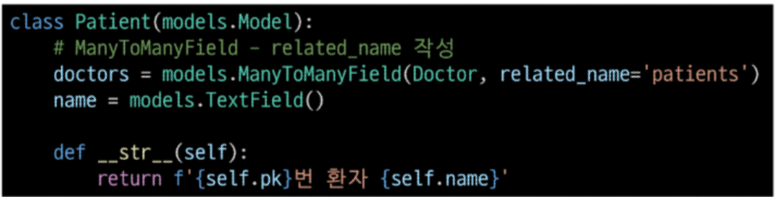 - Django의 ManyToManyField는 M:N 관계를 맺는 두 모델 어디에 위치해도 상관없음