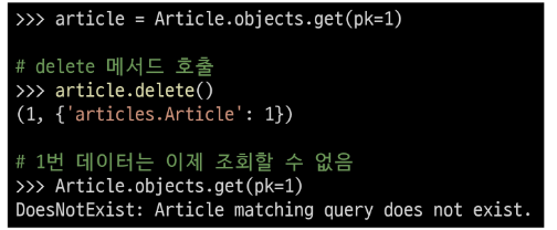 - 삭제하고자 하는 article 인스턴스 객체를 조회 후 반환 값을 저장