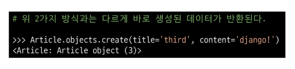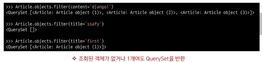 - 단, 데이터베이스가 단일한 객체를 반환할 때는 QuerySet이 아닌 모델의 인스턴스로 반환됨