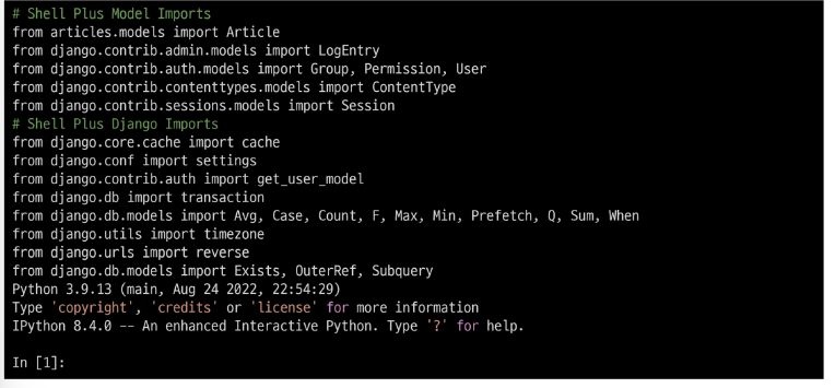 - 다만 일반 파이썬 쉘을 통해서는 장고 프로젝트 환경에 영향을 줄 수 없기 때문에 Django 환경 안에서 진행할 수 있는 Django 쉘을 사용