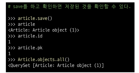 - 단순히 모델 클래스를 통해 인스턴스를 생성하는 것은 DB에 영향을 미치지 않기 때문에 반드시 save를 호출해야 테이블에 레코드가 생성됨