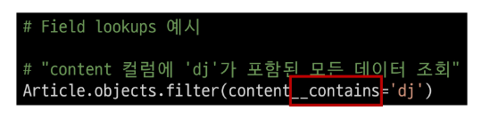 - QuerySet 메서드 filter(), exclude() 및 get()에 대한 키워드 인자로 지정됨