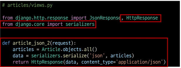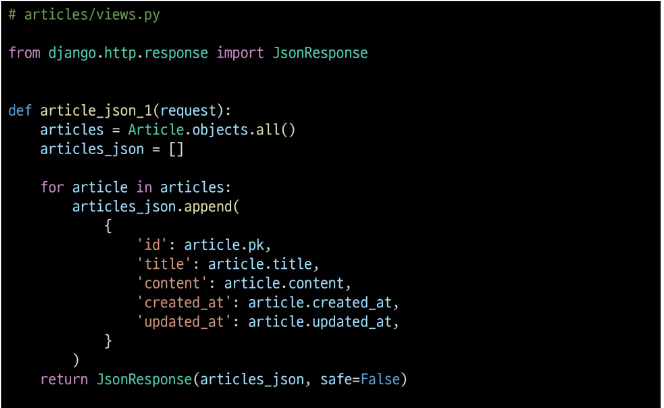 - Django가 기본적으로 제공하는 JsonResponse 객체 활용하여 Python 데이터 타입을 손쉽게 JSON으로 변환하여 응답 가능