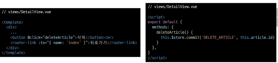 - DeleteView 컴포넌트에 삭제 버튼을 만들고, mutations를 호출