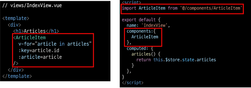 - IndexView 컴포넌트에서 ArticleItem 컴포넌트 등록 및 props 데이터 전달