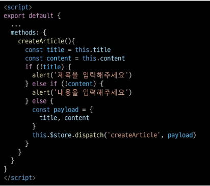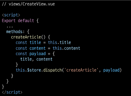 - actions에서는 넘어온 데이터를 활용하여 article 생성 후 mutations 호출