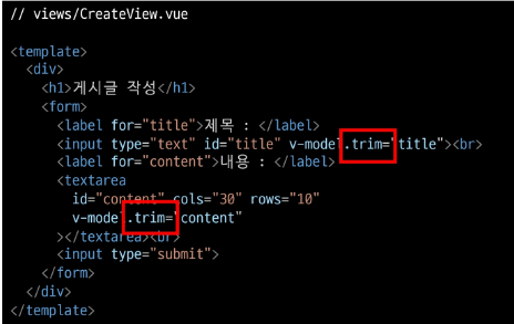 - v-model.trim을 활용하여 입력 값의 공백을 제거