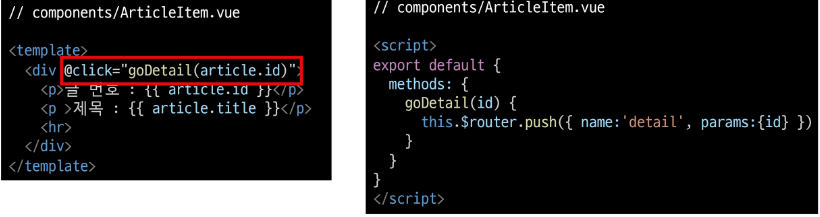 - 각 게시글을 클릭하면 detail 페이지로 이동하도록 ArticleItem에 이벤트 추가