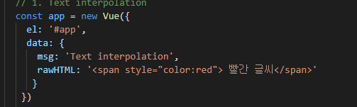 - Template interpolation 방법은 HTML을 일반 텍스트로 표현