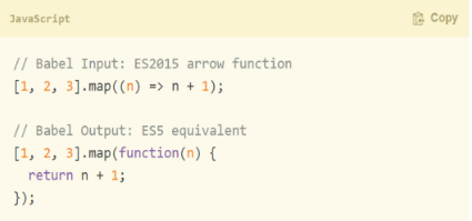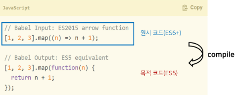 - 원시 코드(최신 버전)를 목적 코드(구 버전)으로 옮기는 번역기가 등장하면서 더 이상 코드가 특정 브라우저에서 동작하지 않는 상황에 대해 게 고민하지 않을 수 있음