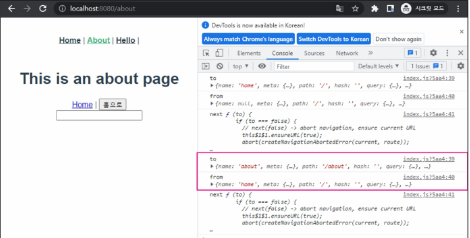 - '/home'으로 이동하더라도 라우팅이 되지 않고 아래와 같이 로그만 출력됨