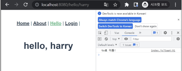 - 첫 번째 출력은 /hello/harry/로 접속 시도 후 (전역 가드에 막힘) 전역 가드에서 login으로 이동 요청 할 때 출력