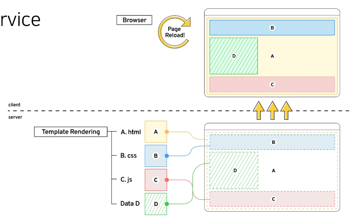 - 정보를 포함한 web 서비스를 구성하는 모든 내용을 서버 측에서 제공